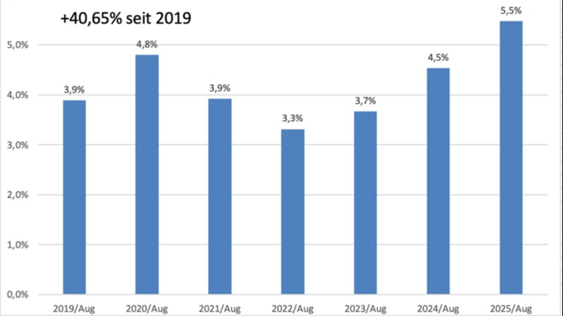 Laut offiziellen Daten des Arbeitsmarktservices (AMS), die campus a vorliegen, betrug die Arbeitslosenquote in der österreichischen IT-Branche im August 2019 noch 3,9 Prozent, während sie 2025 bei 5,5 Prozent lag. Zwischen 2019 und 2025 gab es einen Anstieg der absoluten Arbeitslosenzahlen von 85,6 Prozent, während die Arbeitslosenquote in der IT-Branche um 40,6 Prozent gestiegen ist, wobei diese Zahl von der gesamten Erwerbsbevölkerung abhängig ist.